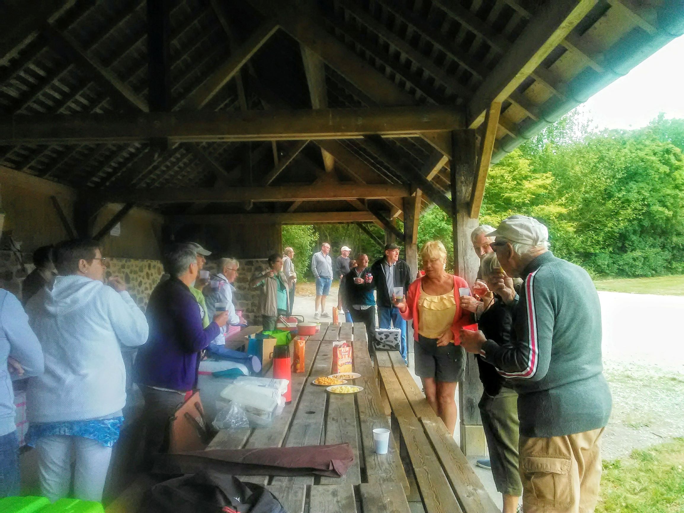 Puis vient le moment de l'apéritif offert par l'association, lors du pique nique ont partageait tout : les salades, la charcuterie, les quiches, les saucisses merguez circulaient de table en table, les chips, le vin et bien sûr les rires puis les chansons, le dessert a connu le même sort, les tartes clafoutis ont succédé aux fromages.